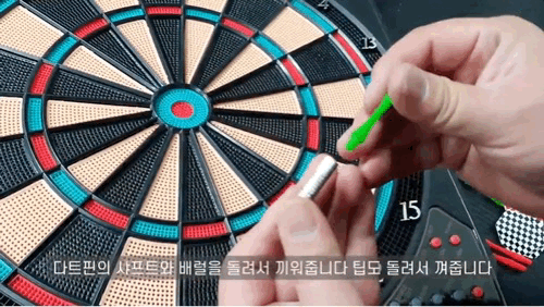 먼저, 다트핀의 샤프트와 배럴을 돌려서 끼워 줍니다